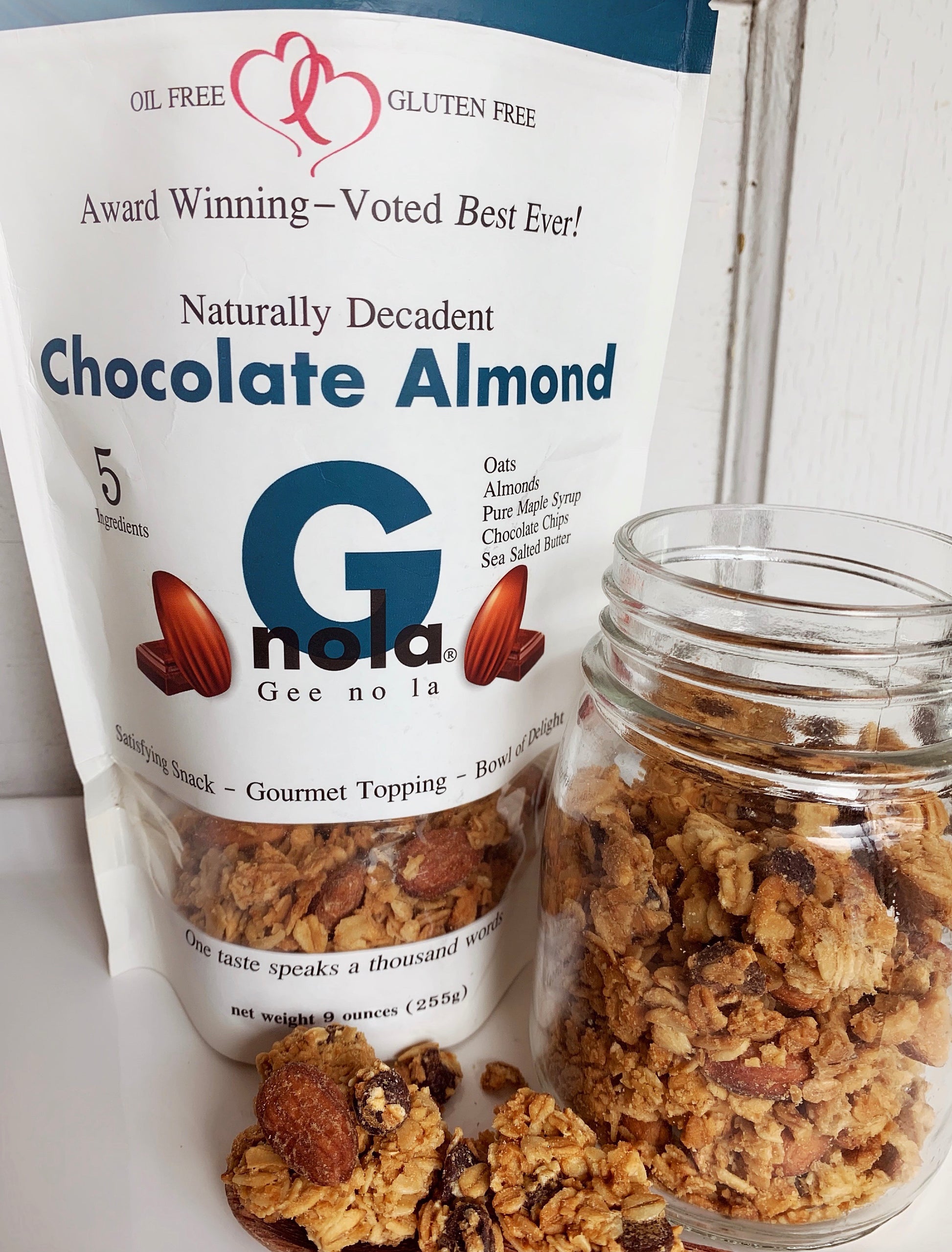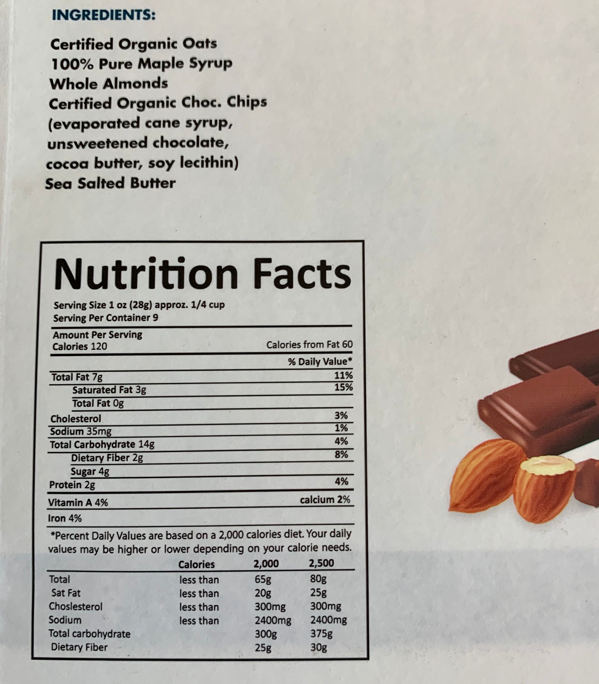 INGREDIENTS: Certified Organic Oats, 100% Pure Maple Syrup, Whole Almonds, Certified Organic Chocolate Chips (evaporated cane syrup, unsweetened chocolate, cocoa butter, soy lecithin) Butter, Sea Salt