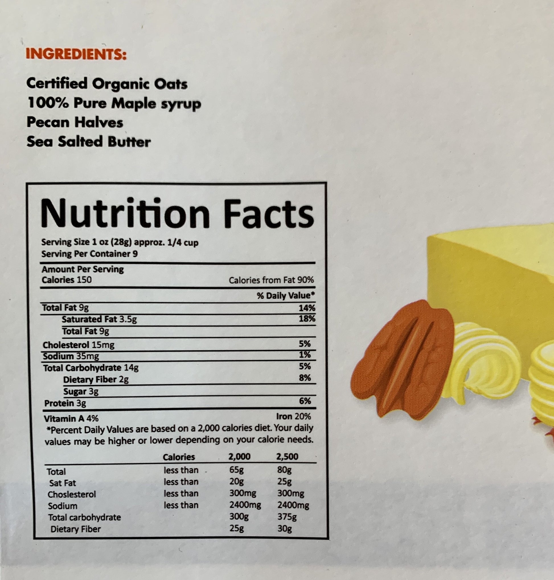 INGREDIENTS: Certified Organic Oats, 100% Pure Maple Syrup, Whole Pecans, Butter, Sea Salt
