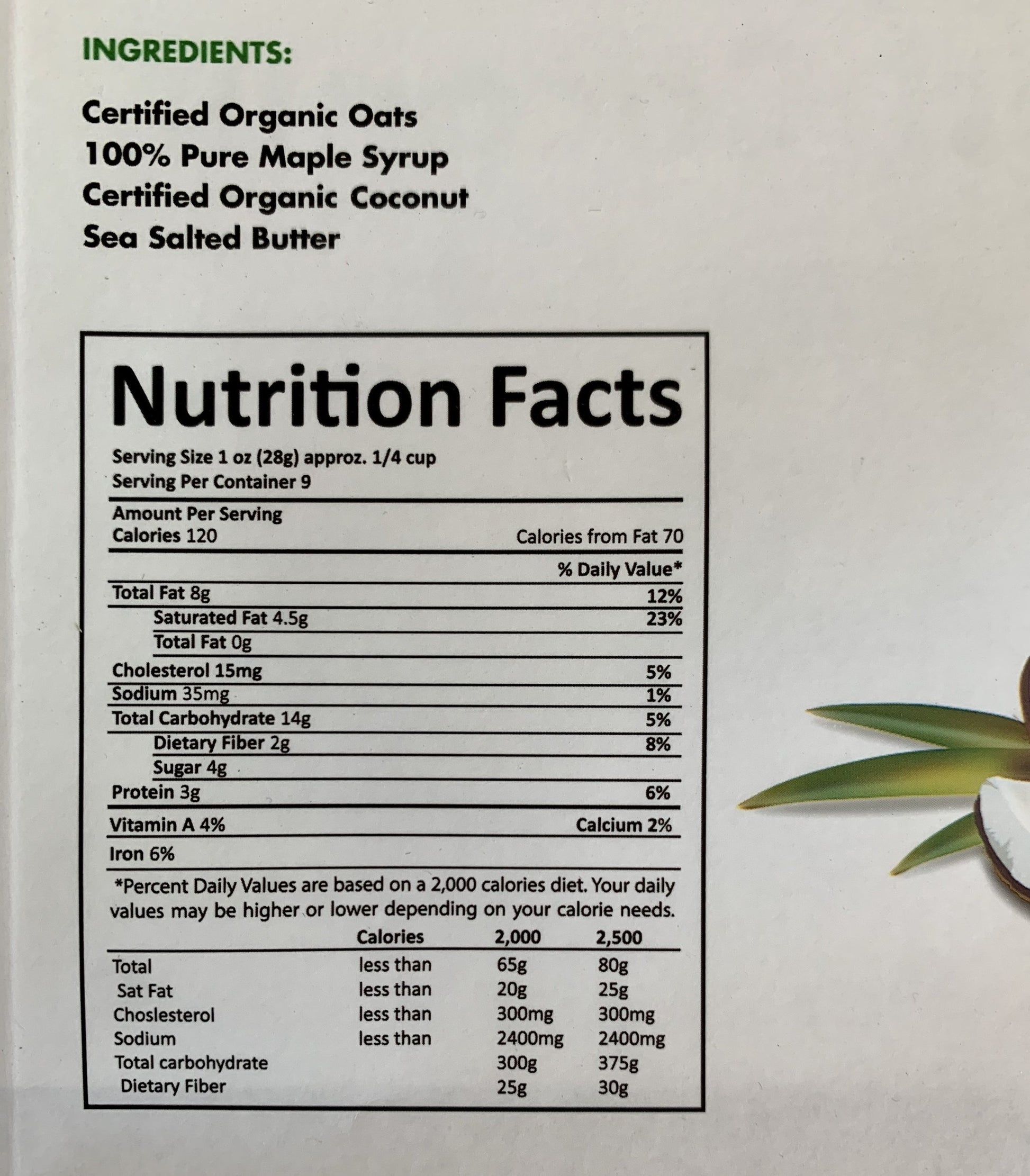 INGREDIENTS: Certified Organic Oats, 100% Pure Maple Syrup, Certified Organic Coconut, Butter, Sea Salt
