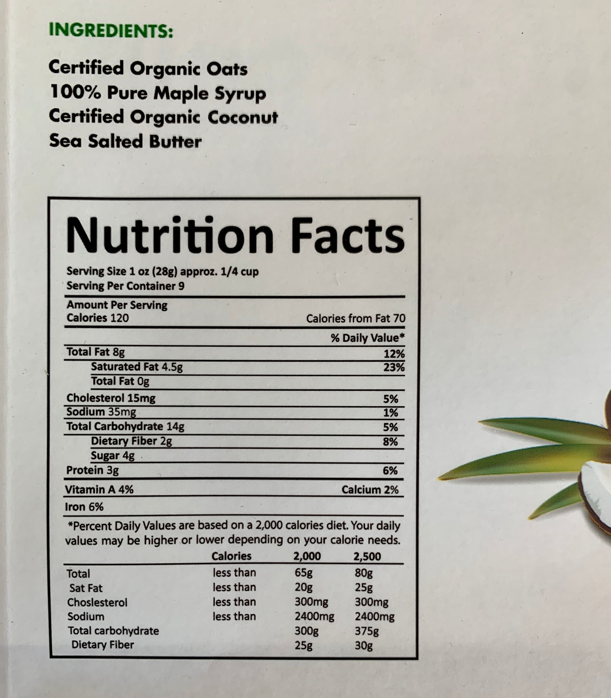 INGREDIENTS: Certified Organic Oats, 100% Pure Maple Syrup, Certified Organic Coconut, Butter, Sea Salt
