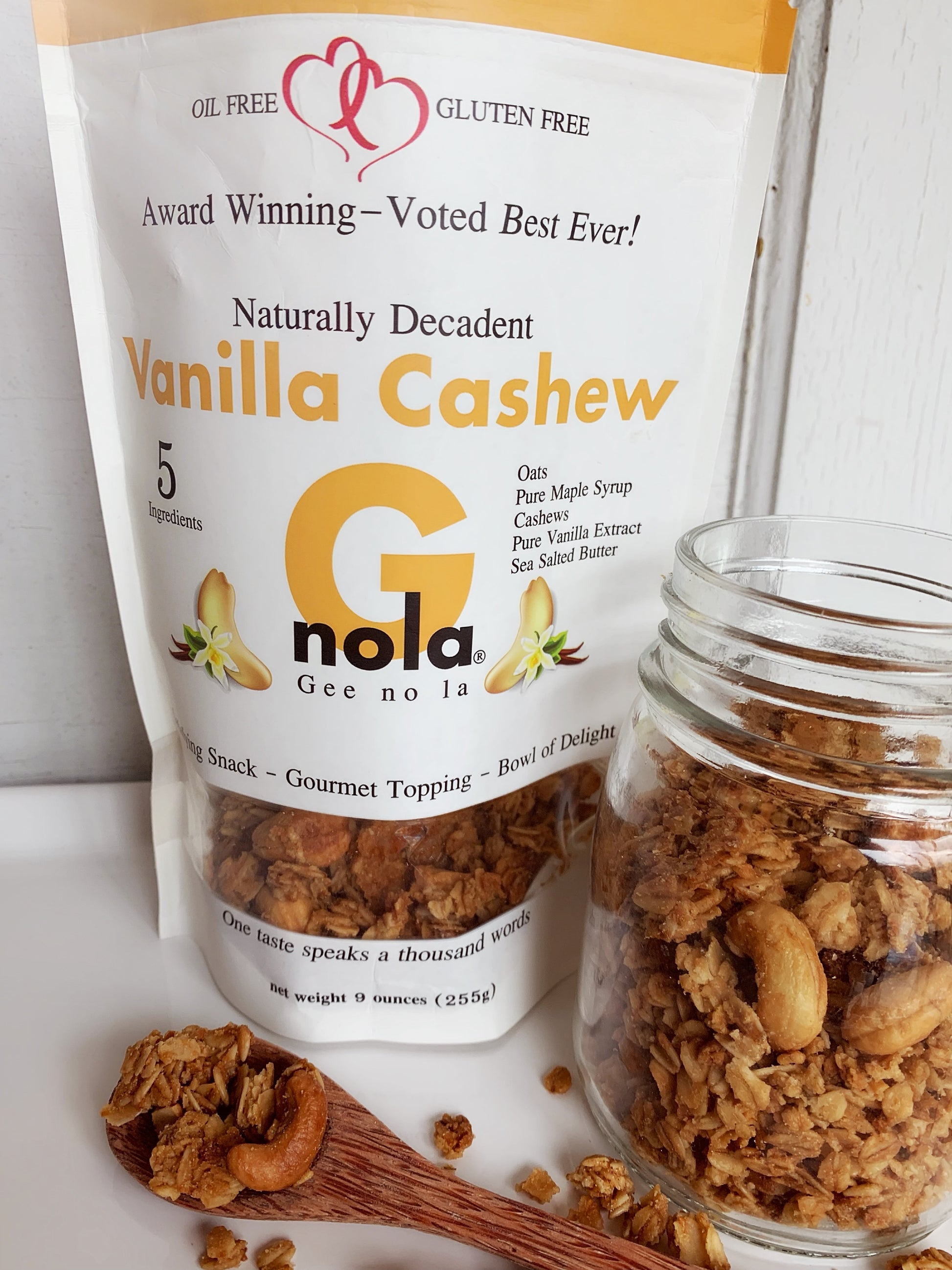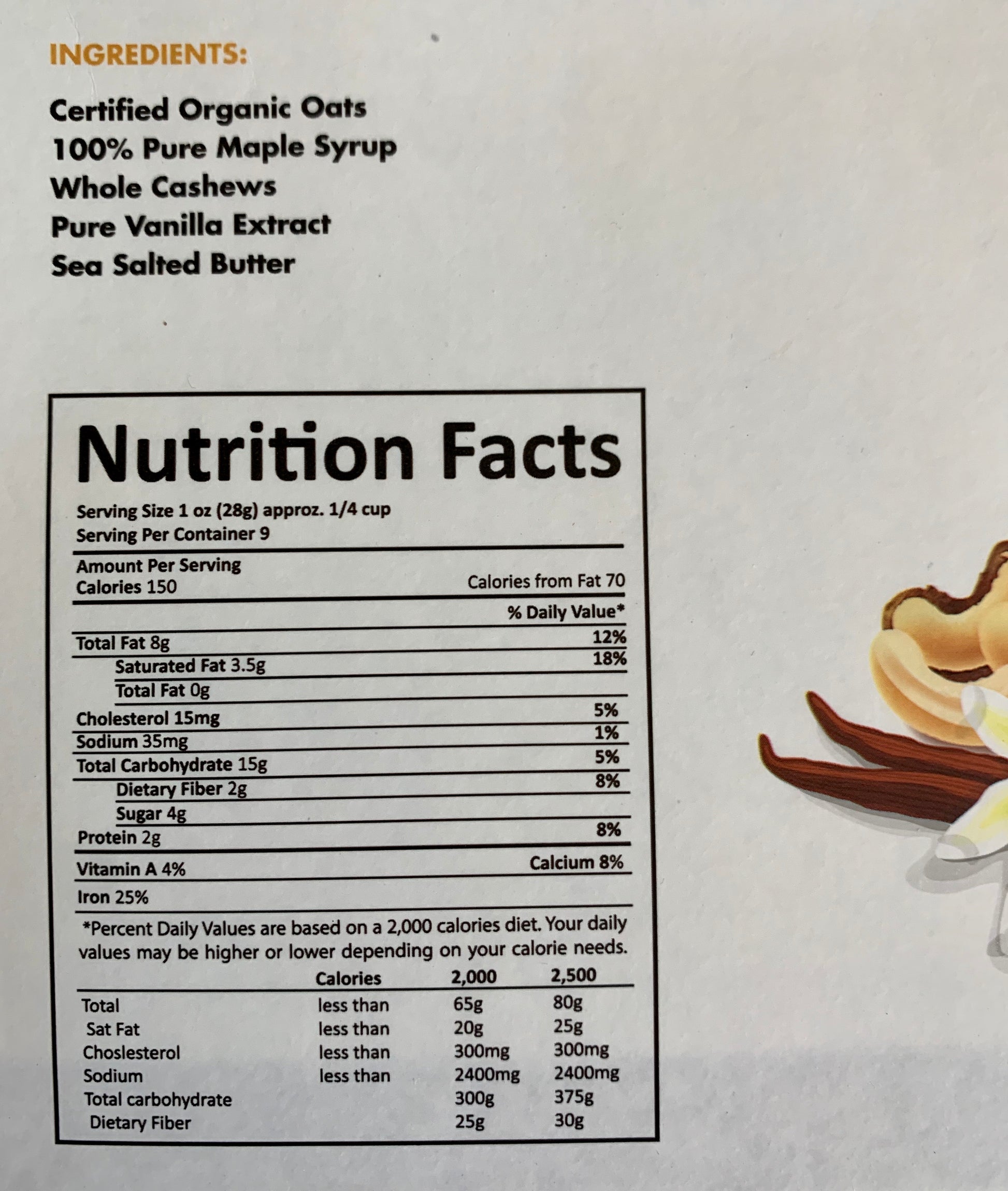 INGREDIENTS: Certified Organic Oats, 100% Pure Maple Syrup, Whole Cashews, Butter, Pure Vanilla Extract, Sea Salt